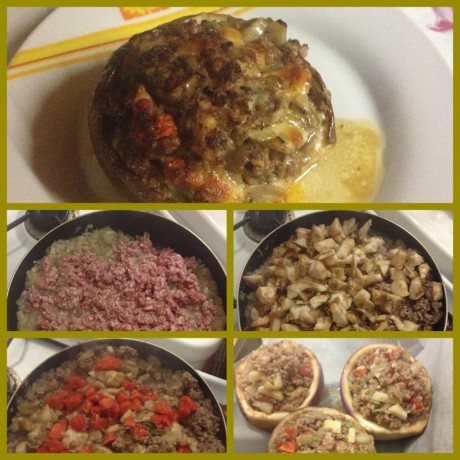 In una padella soffriggere e lasciare imbiondire la cipolla; aggiungere la carne tritata e mezzo bicchiere di vino bianco. Sbriciolare la carne tritata servendosi di un cucchiaio di legno fin quando il vino e’ evaporato del tutto.