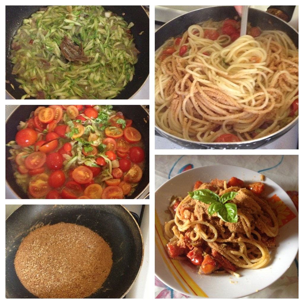 In una padella fate soffriggere la cipolla tagliata a dadini e lo spicchio d’aglio con olio extravergine di oliva. Tagliate le zucchine a julienne e unitele alla cipolla e sfumate con un pó d’acqua. A metà cottura, aggiungete i filetti di acciuga e dopo che si saranno spappolati aggiungete anche i pomodorini tagliati a metà, salate e aggiungete il peperoncino e lasciate cuocere per 5 min circa. Nel frattempo, portate ad ebollizione abbondante acqua, salate e buttate gli spaghetti. Per ultimo, fate tostare in un padellino il pangrattato e aggiungete un pizzico di sale. Scolate gli spaghetti al dente e saltate con il sughetto di zucchine e pomodorini e infine cospargete con il pangrattato tostato e con del basilico fresco. Servire caldo e buon appetito!