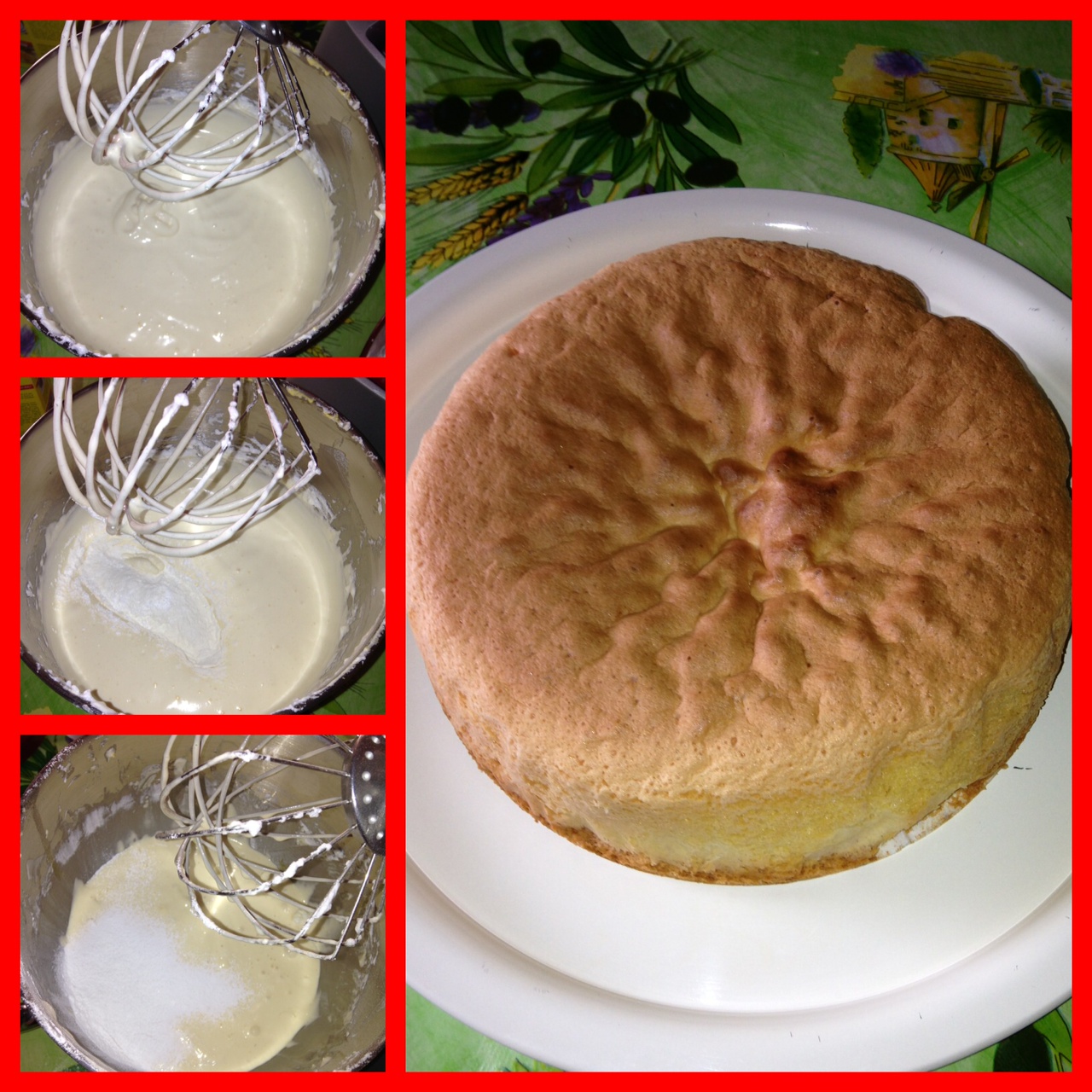 In a mixer whip the egg yolks with half of sugar until it becomes a cream. Separately, whip the egg whites with the other half of sugar and add to the mixture of egg yolks and sugar. Add gradually the flour and cornstarch until you have a smooth and homogeneous mixture. Finally, add the baking powder. Line a baking tin with parchment paper and put the mixture. Bake at 180 degrees for 20/25 min.