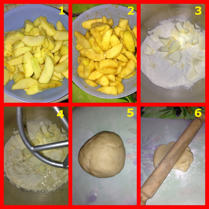 First peel the apples, remove the core and cut into small pieces (1). Put the apples in a bowl and add the juice, the zest of one lemon, sugar, cinnamon, ginger, nutmeg and flour (2). Prepare the brisè dough, mixing together cold water, flour and butter at room temperature cut into small pieces (3/4). Continue to mix until you get a smooth and well compacted dough (5). Wrap the dough in the plastic wrap and let rest in refrigerator for at least 30  minutes. Then, divide the brisè dough in half and roll out a half on a sheet of parchment paper (6) and place it on the bottom of a baking tin (7). Prick the dough with a fork and put inside the apple (8). Roll out also the other half of dough (9) and place it over the filling and prick the surface with a fork (10). Close the edges, so as not to release the liquid during cooking (11) and brush the surface with beaten egg yolk (12). Bake for approximately 50/60 minutes at 180 degrees (13/14).