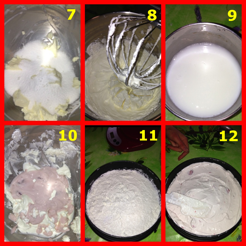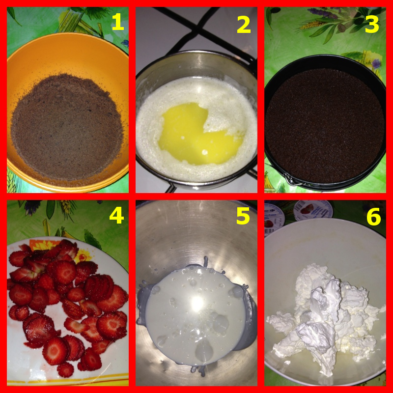 Per preparare la base della cheese-cake, sminuzzate con un mixer i frollini al cacao (1). Unite il burro fuso e lo zucchero di canna ai frollini sminuzzati e amalgamate bene (2). Rivestite una teglia con della carta forno e versate il composto, appiattite bene la superficie con l’aiuto di una spatola (3) e lasciate riposare in frigo per circa 30 minuti. Nel frattempo preparate la crema. Montate per prima cosa la panna (5/6), poi sbattete il formaggio fresco con lo zucchero a velo (7/8). Successivamente, incorporate al composto anche la panna montata. Sciogliete in un pentolino la gelatina in fogli, precedentemente ammollata in acqua, con due cucchiai di latte (9). Lasciatela raffreddare un minuto e poi incorporatela al composto cremoso. Dividete la crema bianca in 3 parti. Versate in una ciotola 1/3 della crema e aggiungete lo yogurt alla fragola (10). Tagliate le fragole a fettine sottili (4) e incorporatene alcune alla crema