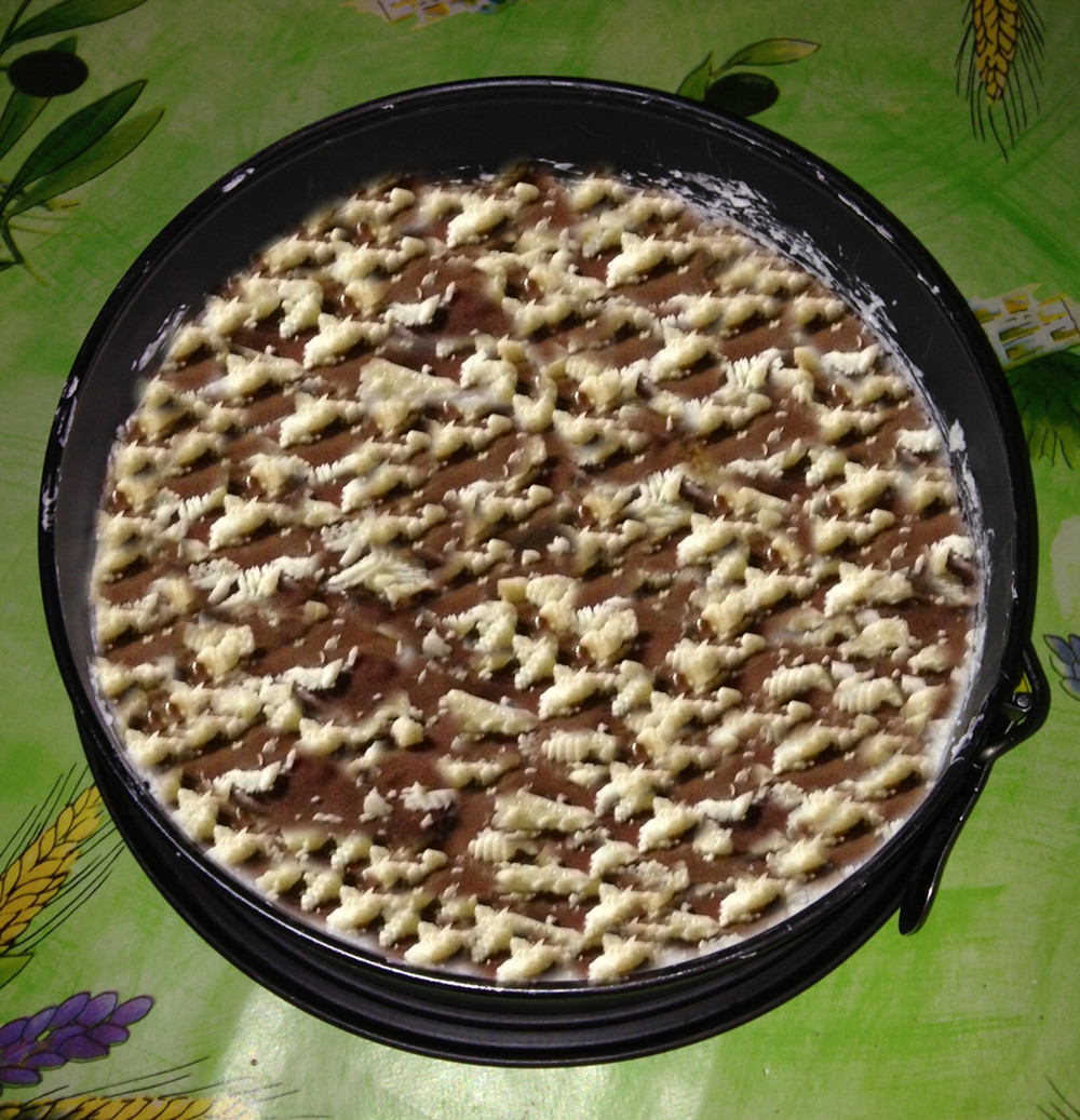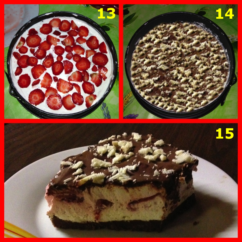 allo yogurt. Versate 1/3 della crema bianca nella teglia, sopra la base di biscotti e livellate bene (11). Poi, versate sopra la crema allo yogurt e le restanti fragole tagliate a fettine (12/13). Finite, quindi, con l’ultimo strato di crema bianca. Lasciate riposare la cheese-cake in frigorifero per almeno due ore. Trascorse le due ore, occupatevi della copertura, sciogliete il cioccolato fondente con qualche cucchiaio di latte e versatelo sulla superficie della cheese-cake. Completate con delle scaglie di cioccolate bianco (14). Lasciate riposare la cheese-cake in frigo ancora per qualche ora prima di servire (15).