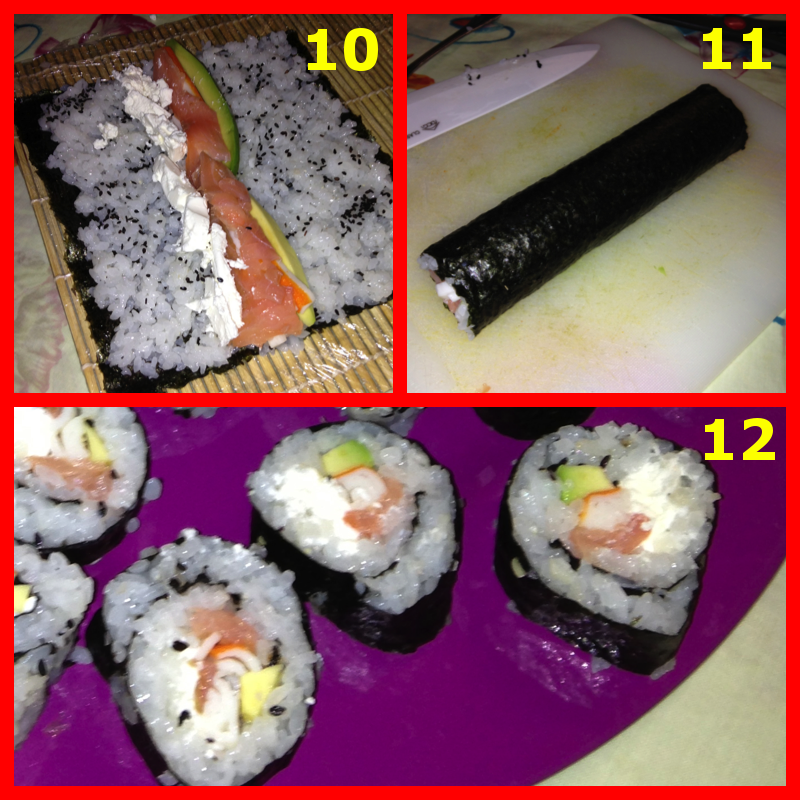 We stuffed a futomaki with surimi cut in half, fresh salmon sticks, strips of avocado and philadelphia (10). Remember that the sticks must have a thickness of about 1 cm and must be positioned at the center. Take the bottom edge of the mat and, pressing with your fingers the central ingredient to the inside, roll the whole thing as a roulade. Maintain a gentle pressure on the roll so as to remain compact, until you will not see the strip of seaweed not covered rice; continue to roll so that the strip of nori without rice seals the whole (11): the moisture of the rice will act by adhesive. You just have to cut the futomaki: put it on a cutting board and wet the knife blade with the acidulated water, cut in half, the two pieces side by side obtained then cut into six equal parts, so you will obtain 12 pieces of futomaki (12).