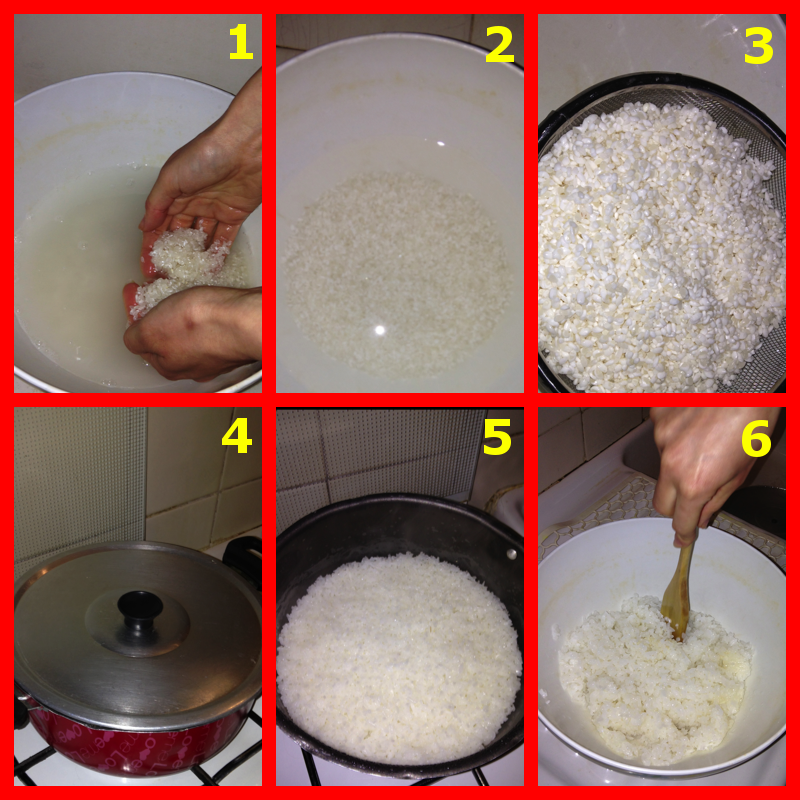 Place the rice in a not too wide pan and cover it with water. Cover with a lid and bring to boil over medium heat (4). Do not open the lid more until you hear the boil. Prepare a wide and low non metal container which will rest the rice. Meanwhile the rice comes to boil, prepare the sauce: pour the rice vinegar in a saucepan, add sugar and salt and heat to dissolve all the sugar, without bringing to boil. Turn off the heat and let cool. As soon as the rice water boil, let it boil over medium heat for 5 minutes, then reduce the heat and cook over low heat for 8-10 minutes. Turn off the heat and let stand covered for another 10 minutes (5). Transfer the rice in the bowl, take a wooden spoon (preferably a flat spatula) and, holding it over the rice, put over the mixture of rice vinegar, so that it goes to sprinkle and it will be better distributed. Move the rice with the spatula (6), not to crush the rice and in the meantime, with the other hand, bursts the rice with a plastic plate or a fan, to cool the whole and to evaporate the vinegar quickly. Once cooled to room temperature, that this is the correct operating temperature, cover it with a clean cloth well moistened with cold water and let it rest for a few minutes. , let it always covered with the damp cloth to prevent drying out of the product fast.