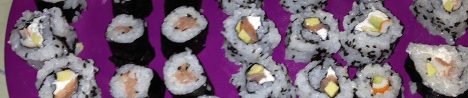 Tagliate a metà una foglia grande di alga nori e posizionatela sulla stuoia apposita (se preferite, potete rivestirla con pellicola trasparente), tenendo la parte più liscia e lucida verso il basso. Bagnate le mani in una ciotola con dell’acqua, possibilmente acidulata con qualche cucchiaio di aceto di riso, e prelevate circa 120 gr di riso per sushi. Stendete il riso su tutta la superficie dell’alga; lo spessore del riso, non deve essere troppo alto. Cospargete il riso con i semi di sesamo neri, o bianchi, secondo i vostri gusti (13). Prendete ora la foglia di alga da una parte e capovolgetela, poggiando ora il riso a contatto con la stuoia. Farcite l’uramaki con gli ingredienti che preferite, due o tre al massimo: noi abbiamo usato bastoncini di avogadro, philadelphia tagliato a strisce di un cm di spessore e bastoncini di salmone fresco (14). Ricordate che i bastoncini devono avere uno spessore di circa 1 cm e devono essere posizionate al centro. Ora prendete il bordo inferiore della stuoia e, premendo con le dita l’ingrediente centrale verso l’interno, arrotolate il tutto come un’involtino (15). Mantenete una delicata pressione sul rotolo affinché resti compatto, modellate il rotolo, premendo uniformemente con le mani nel senso della lunghezza. Per tagliarlo: mettetelo su un tagliere e bagnate la lama del coltello con l’acqua acidulata; tagliatelo a metà, affiancate i due pezzi ottenuti quindi tagliateli in tre parti uguali, così otterete 6 pezzi di futomaki (16).