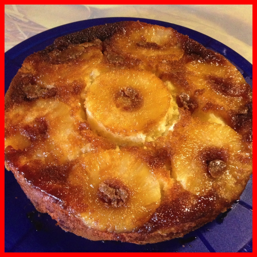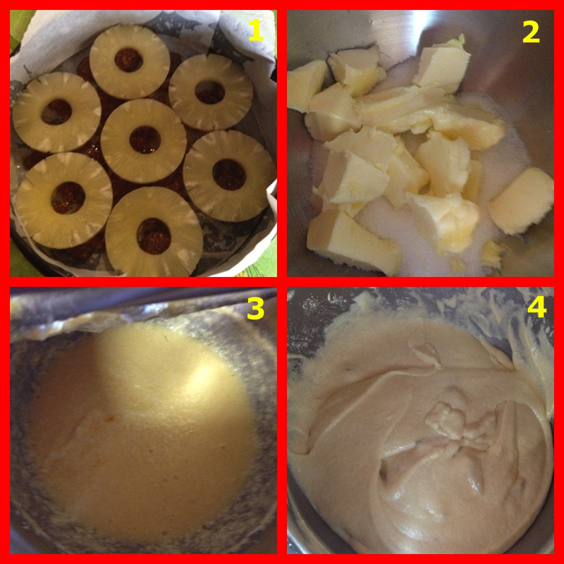 Per prima cosa preparare il caramello facendo sciogliere in una casseruola il burro e lo zucchero di canna. Rivestite una teglia di carta forno e versare il caramello caldo, livellandolo con una spatola, e le fette di ananas sgocciolate e mettetela da parte (1). Tagliate le rimanenti fette di ananas a dadini. In una planetaria, montate zucchero e burro (2) e poi versate le uova, finché non otterrete un composto cremoso (3). Versate piano piano la farina, poi la vanillina, lo sciroppo (o il succo) di ananas e per ultimo il lievito e amalgamate bene fino ad ottenere un composto omogeneo. Aggiungente infine i dadini di ananas e mescolate bene (4). Versate il composto nella teglia utilizzata precedentemente e infornare in forno caldo a 180° per circa 50-60 min. Rovesciate la torta appena sfornata in un vassoio da portata, togliendo con cura la carta forno.