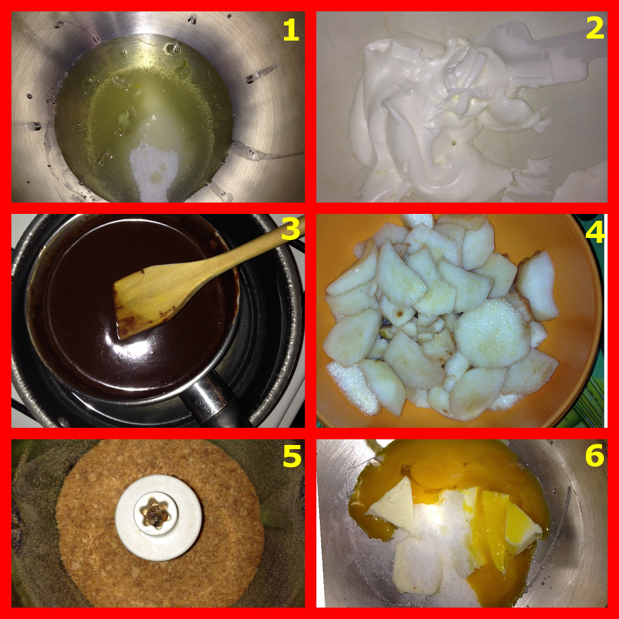 Per prima cosa, iniziate sbucciando le pere e tagliatele a pezzettini (4). Sciogliete a “bagnomaria” il cioccolato con 100g di burro (3). In una planetaria, sbattete il burro rimasto con metà dello zucchero e i tuorli d’uovo finchè non otterrete un composto cremoso (6-7) e poi aggiungete il cioccolato fuso (8). Unite gli amaretti sbriciolati (9), la farina, il lievito (10) e poi gli albumi montati a neve con la metà di zucchero rimanente (11-12). Versate metà dell’impasto in una teglia rivestita di carta forno (13). Poi versate le pere taliate a dadini (14) e infine coprite con l’altra metà dell’impasto (15). Infornate a 180° per circa 30-40 min. Prima di servire, spolverate la superficie della torta con zucchero a velo (16).