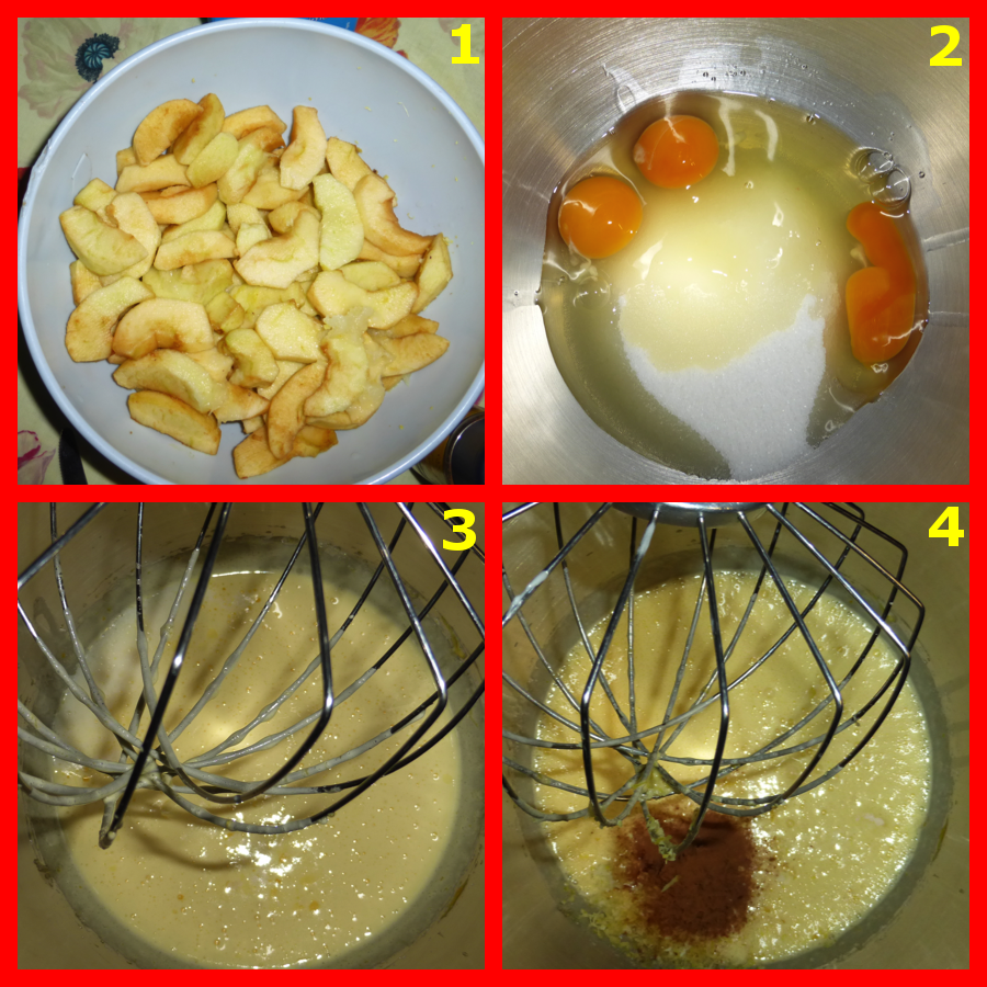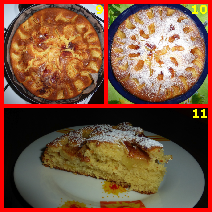 Sbucciate le mele e tagliatele a fettine sottili e poi irroratele con il succo di un limone (1). In una planetaria, mescolate lo zucchero con le uova (2) e poi aggiungete il burro fuso, finchè non otterrete un composto cremoso (3). Unite la scorza grattugiata del limone, la cannella, il latte, il lievito, la vanillina, il pizzico di sale (4) e la farina piano piano e amalgamate bene (5-6). Infine unite le mele e mescolate bene (7). Rivestite di carta forno una teglia e versate il composto (8). Prima di infornare, spolverizzate la superficie della torta con cannella e zucchero a velo. Cuocere in forno caldo a 180° per 50-60 min (9). Servite spolverizzando ancora con cannella e zucchero a velo (10-11).
