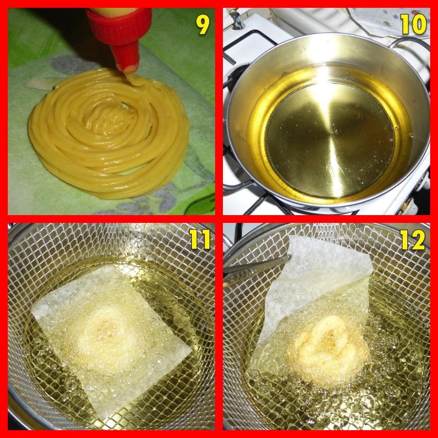 Melt in a pan the butter cut into small pieces (1), pour the water and salt and then bring to a boil (2). When the water reaches a boil, remove the pan from the heat and pour in the flour, stirring with a whisk initially (in order to avoid the formation of lumps) and then continue stirring with a wooden spoon to get a compact ball (3). Put the mixture in a mixer, add sugar, 1 egg and lemon zest (4).Using the supplied hook leaf knead until you get a homogeneous mixture. Add the eggs one at a time, adding the following only when the former will be completely absorbed (5-6-7). Put the mixture into a pastry bag with starry mouth (8). Cut squares of parchment paper, squeeze the mixture over each square with a spiral motion (9). In a saucepan bring the oil for frying at about 150-160 °C (10) ; immerse a donut at a time still attached to the baking paper (11) , which will come off by itself after a few seconds (12). Fry the donuts until complete browning (13), put them to dry in absorbent paper (14).