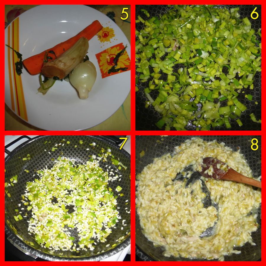Take the quails eviscerated and remove any pens present. Boneless quails using a sharp knife: remove the drumstick arc that goes from the chest to the head, remove the legs twisting and then tearing, cut the breast in half staying attached to the bone (1-2). In a large saucepan pour water, add the onion, carrot, celery, a sprig of parsley, a teaspoon juniper berries, bay leaf, some peppercorns and salt (3). Bring to a boil and then add the carcasses of quails; simmer for 20 minutes on low heat (4). Strain the broth quails keeping aside vegetables (5) and carcasses. In a pan fry in olive oil the leek finely chopped (6); add the rice and toast and then pour in the white wine (7). Cook the rice adding a ladle of broth at a time; at the end of cooking stir in the Parmesan cheese, pepper and a bit of butter (8). Grease 4 aluminum molds, sprinkle with breadcrumbs and then invert them in order to eliminate the excess of bread (9). Fill the molds with the rice, pressing with a spoon so you get a well filled Timballo (10); Let rest the molds in the refrigerator.