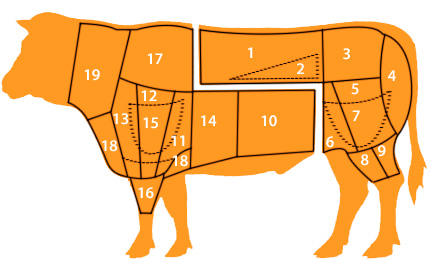 Tagli identici, inoltre, possono variare come denominazione da regione a regione e talvolta da provincia a provincia (vedasi: roast-beaf/MI = trinca/PA; rotondino/GE = megatello/MI; campanello/PG = pesce/MI). Ecco l’elenco dettagliato dei tagli appartenenti ad ogni categoria (il numero riportato tra parentesi si rifà ai numeri utilizzati nell’immagine sottostante)
