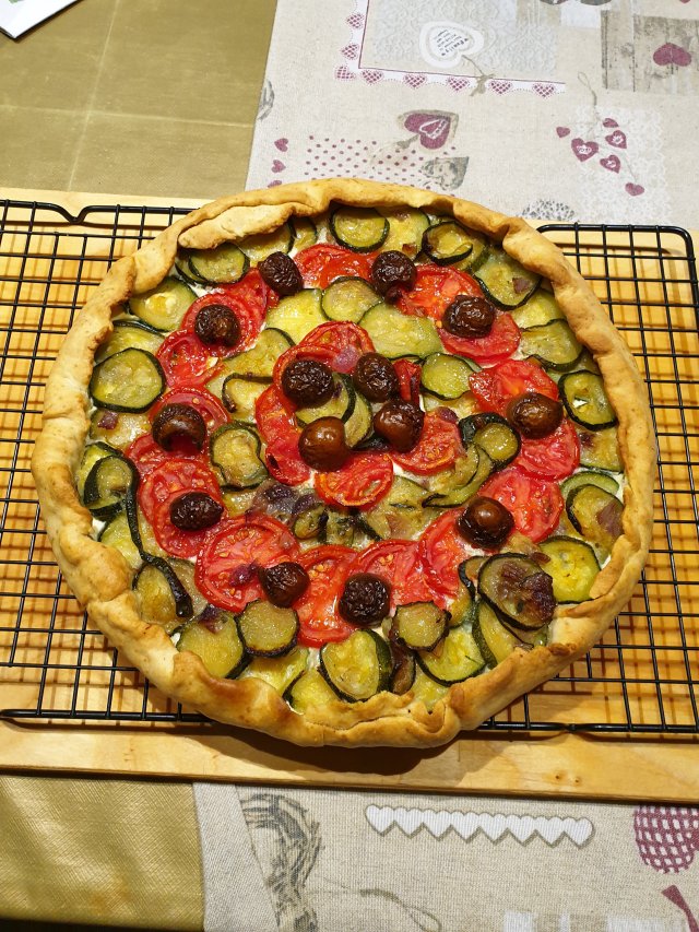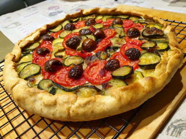 Per l’impasto, in una planetaria versate la farina, il lievito, l’olio e l’acqua. Impastate fino ad ottenere un ccomposto omogeneo. Utilizzate un matterello per stendere l’impasto al fine di ottenere una sfoglia spessa circa mezzo centimetro. Adagiate la sfoglia in una teglia rotonda da 30cm e bucherellate la base servendovi di un forchetta. In una ciotola aprite un uovo, aggiungete la ricotta e un po di prezzemolo, salate ed amalgamate il composto. Versatelo sulla base della sfoglia e livellate servendovi di un cucchiaio. Decorate con le zucchine ed i pomodorini tagliati a fettine, ed aggiungete le olive. Accendete il forno a 200 gradi, cuocete per 30 min circa fin quando i bordi non saranno dorati.